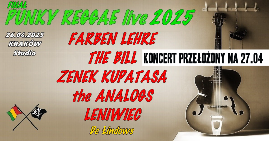 Impreza odbędzie się, zgodnie z planem, w klubie Studio w tym samym zestawie kapel, ale wystartuje o godzinie 16:00! Bramy klubu zostaną otwarte o 15:30! Niestety, ale jest to jedyny realny termin, aby finał w Krakowie odbył się w tym samym miejscu oraz w takim samym składzie sześciu zespołów… Przepraszamy za zaistniałą sytuację, ale wynika ona z wyższej konieczności, na którą – jako organizatorzy – nie mamy żadnego wpływu. Do zobaczenia w najbliższą niedzielę w Krakowie na „Grande Finale” trasy PUNKY REGGAE live 2025! – informuje organizatorzy.
