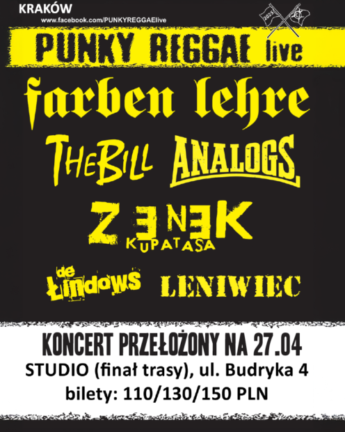NOWA DATA st-punkyreggaelive-27-04_fb-1200x628-coverW związku z żałobą narodową ogłoszoną na dzień 26 kwietnia krakowski Klub Studio przełożył finałowy koncert trasy Punky Reggae Live z 26 kwietnia na niedzielę 27 kwietnia.