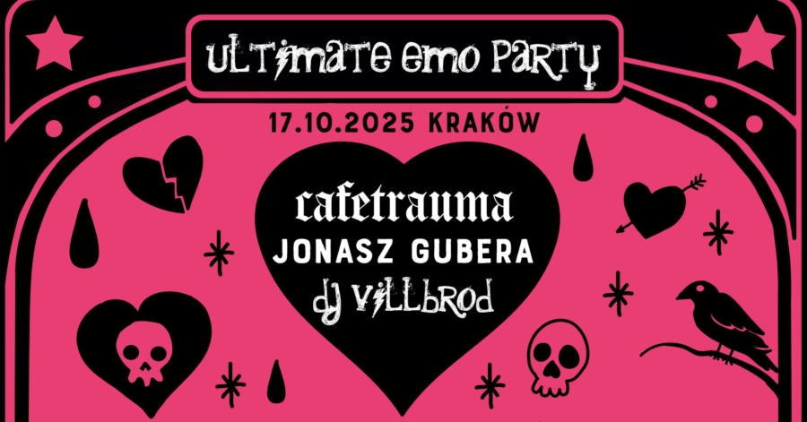 Ultimate Emo Party odwiedzi krakowski Klub Zaścianek (Rostafińskiego 4). O dobry klimat zadbają Cafetrauma, Jonasz Gubera i DJ VILLBRØD. Impreza odbędzie się 17 października. – Bramka od 20:00, impreza do 3 rano! Pamiętajcie o wygodnych butach i do zobaczenia- zapraszają organizatorzy. Bilety kosztują: 50 zł (przedsprzedaż) / 60 zł (w dniu imprezy).